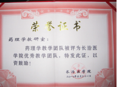 老教师传、帮、带,青年教师大胆创新,促使教学水平不断提高,荣获多种奖励。获山西省教学名师1人,长治医学院优秀教师4人次;全国医药院校实验教学改革大赛二等1项,山西省教学成果特等奖1项、一等奖1项,长治医学院教学成果特等奖1项、一等奖1项;山西省青年教师教学基本功大赛等奖2项,长治医学院青年教师教学基本功大赛二等奖2项、三等奖2项;指导学生获全国药学专业大学生实验技能竞赛二等奖、三等奖各1项,指导学生获山西省兴晋挑战杯”大学生课外学术科技作品竞赛三等奖1项。