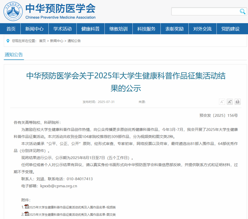 为激励在校大学生健康科普作品创作热情,向公众传播更多原创优秀健康科普作品,今年3月-7月,中华预防医学会联合中国疾病预防控制中心开展了2025年大学生健康科普作品征集活动。本次活动共收到全国104家院校推荐的309部作品,分为视频类和图文类2种。本次活动秉承“公平、公正、公开”原则,经形式审查、专家初审,网络投票以及终审,最终遴选出64部优秀作品,视频类图文类各32部,81部入围作品。
