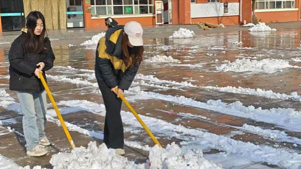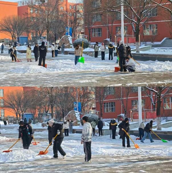 接到除雪通知后,师生们不畏严寒,积极响应,纷纷拿起扫帚、雪铲等工具,奔赴责任区域。